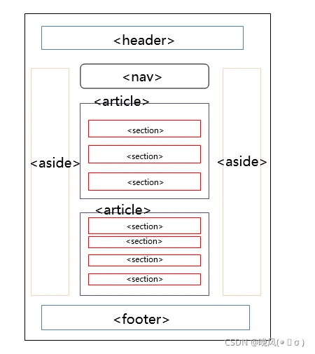 Web语义化,语义元素标签即为更明确、清楚的元素标签,使开发者、浏览者更加理解其内容。 比如,下列是一个网站的基本的语义元素标签的页面,其中包括头部标签、底部标签、内容栏标签等等,这些都是一个个块: