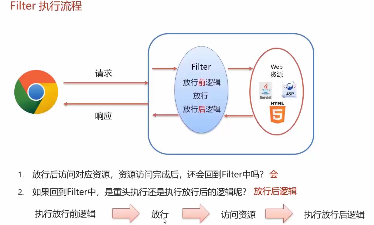 web.xml中配置<filter-mapping>在doFilter方法中书写放行前和放行后逻辑代码,在逻辑中间书写放行代码