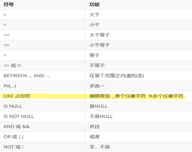 模糊查询使用like关键字,可以使用通配符进行占位: